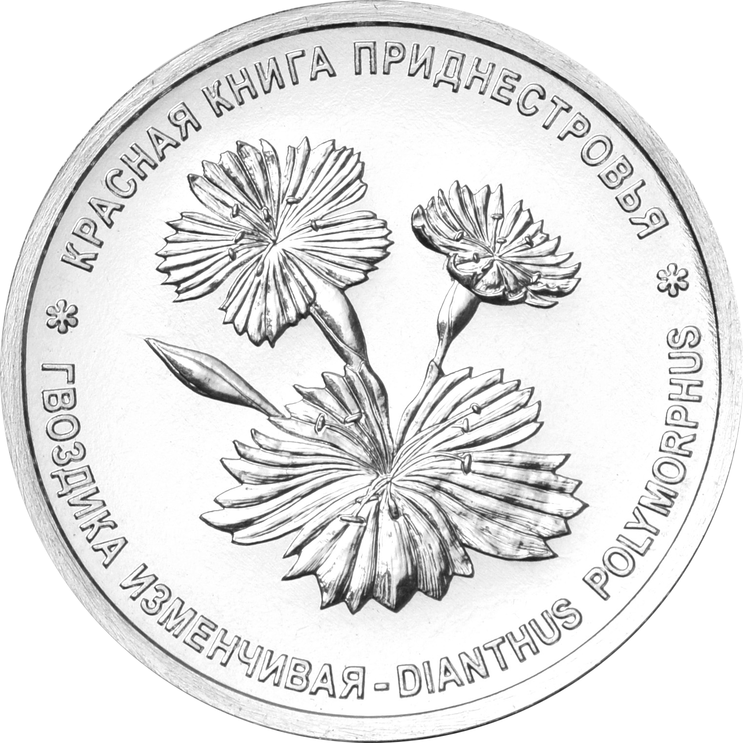 в центре – изображение цветков и бутона гвоздики изменчивой; по кругу – надписи: вверху – «КРАСНАЯ КНИГА ПРИДНЕСТРОВЬЯ», внизу – «ГВОЗДИКА ИЗМЕНЧИВАЯ – DIANTHUS POLYMORPHUS».